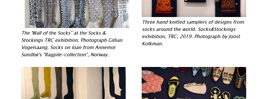 A new exhibition, ‘Socks & Stockings: A world full of surprises’, has opened at the Textile Research Centre in Leiden , tying in with the Texel Stockings Project and our 2019 Knitting History Forum conference. On display are the original seventeenth century Texel silk stockings, the hand-knitted reconstructions made by the team of volunteers for the project as well as many socks from around the world in knitting and nalbinding, including some from Annemor Sundbø’s “Ragpile-collection”, in an informative and fascinating array of techniques, patterns and colours as inspirational to knitters as scholars and students of knitting history. The exhibition runs until 19 December 2019 but is also opening especially for us on Friday 1 November from 12.30pm to 2pm and again on Sunday 3 November from 10pm to 12.30pm, so Knitting History conference delegates may enjoy viewing at leisure.